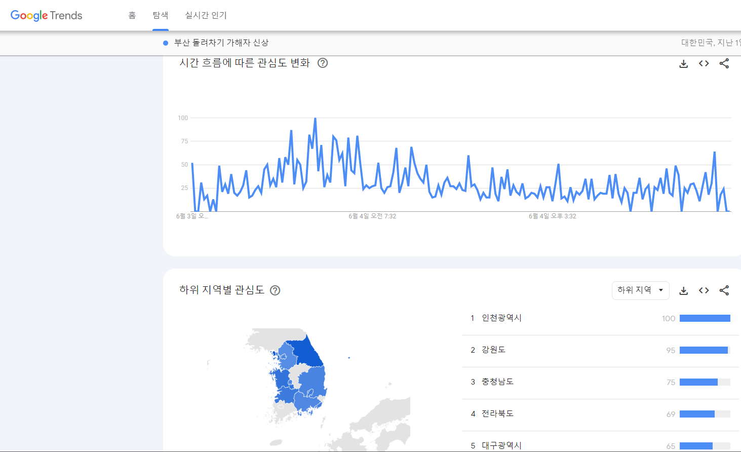 대한민국 내 어떤 지역에서 검색이 이뤄지고 있는지에 대한 관심도를 보여 줍니다.